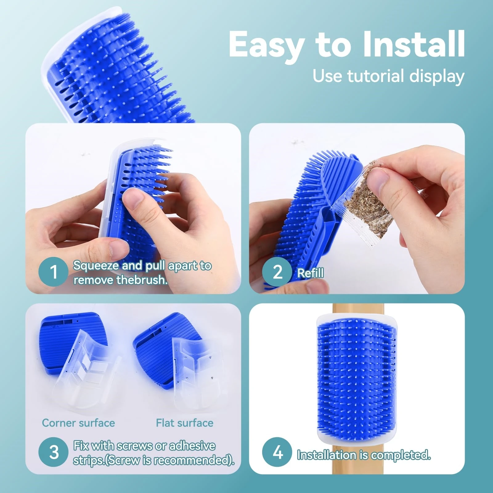 Easy to Install - Our cat corner scratcher brush sets include of 16 screws and 16 adhesive strips, which can perfectly satisfy the installation and you just need a screwdriver. The cat rubbing corner brush is suitable for all kinds of planes, table corners, sofas, stool legs, wall corners, desks, etc..