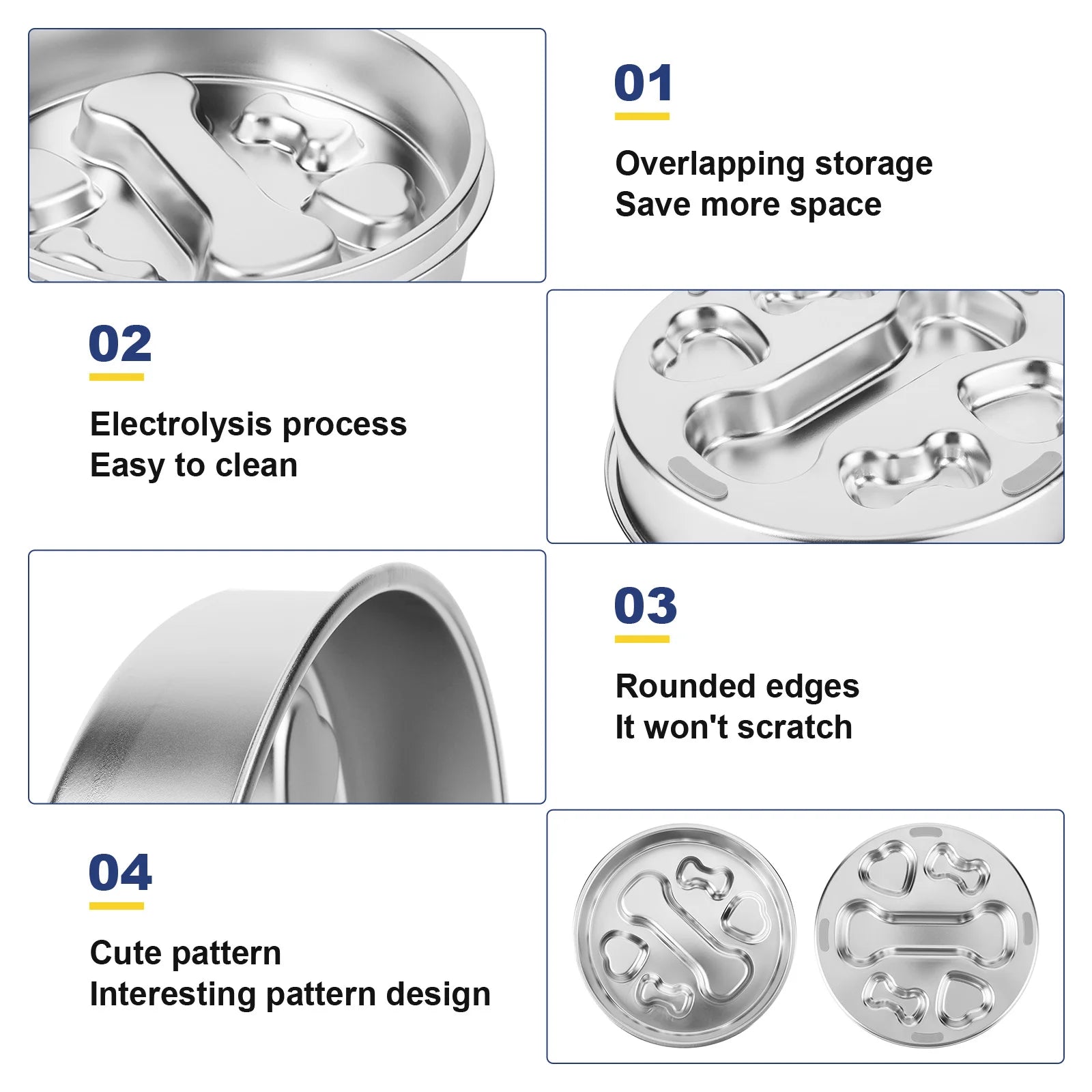 Features: 1.Healthy Eating with Slow Feeder Design: This 304 stainless steel pet dog slow feeder bowl is designed to slow down your pet's eating speed, preventing choking and vomiting. The slow feed columns ensure safer and more enjoyable eating experiences, promoting proper chewing and swallowing. 2.Adorable Bone Design: Featuring a bone shape beloved by dogs, this dog water bowl is not only functional but adds a touch of cuteness to your pet's mealtime. 3.Easy to Clean: Made from premium quality 304 stainless steel, this pet food bowls are sturdy and scratch-resistant. The smooth surface and rounded edges make cleaning effortless, ensuring hygiene and longevity. 4.Large Capacity with Non-Slip Base: This dog water bowl features a spacious design, accommodating ample food without frequent refills. The non-slip base ensures stability during feeding, preventing the bowl from sliding for a comfortable dining experience. 5.Versatile Use: This dog wat serves multiple purposes. The front can be used as a slow-feed bowl, while the back doubles as a treat or licking bowl. Suitable for both dry and wet food, providing versatile feeding solutions for your furry friend. Specification: Origin: Mainland China Shape: Rounded Material: Stainless Steel Product size: about 22*4cm (diameter*height)