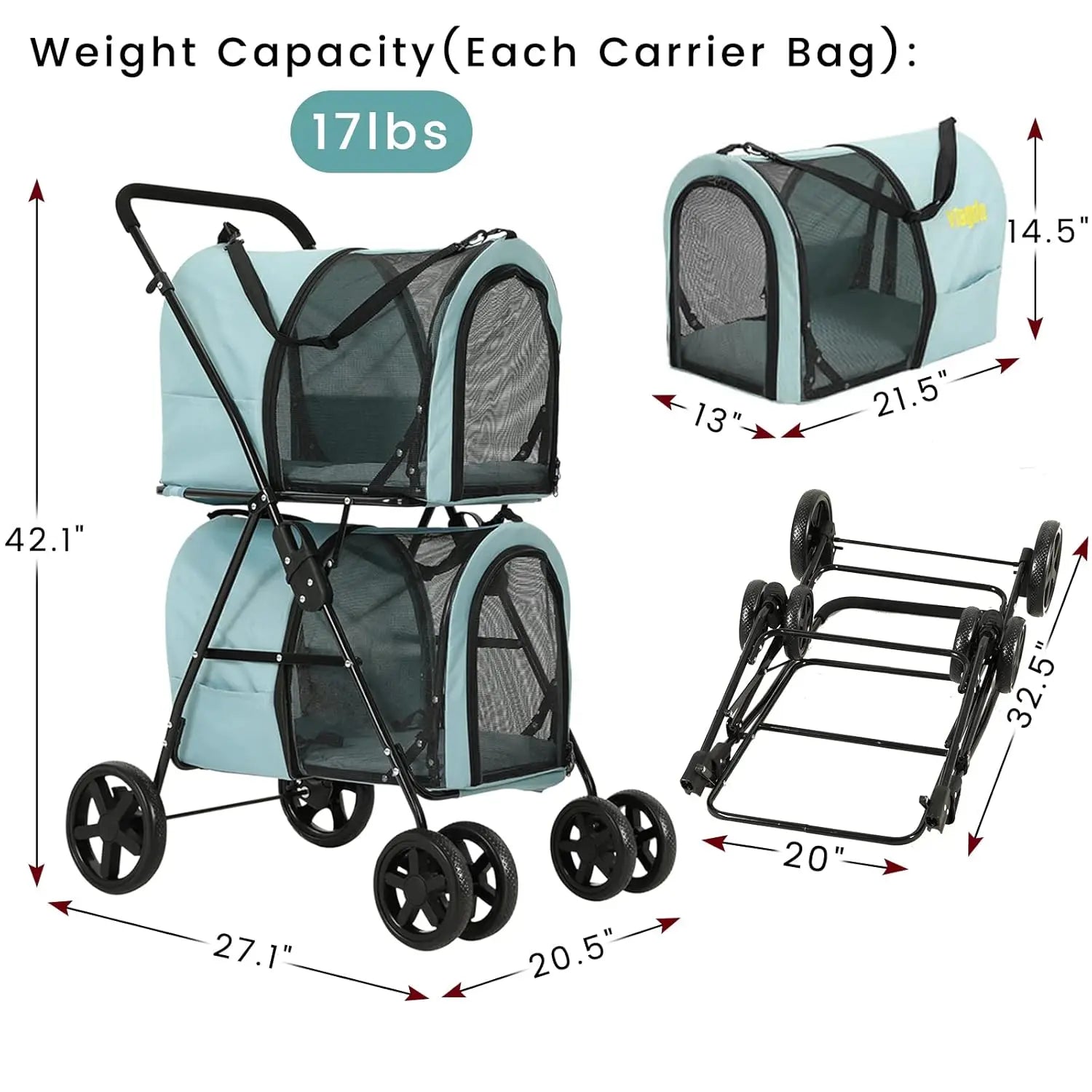 - 【3-IN-1 USE 】All in One: this foldable pet stroller can be used as Double Pet Stroller or Pet Travel Carriers or Pet Booster Car Seat. You can decide how to use it according to your different ways of going out. Each pet carrier size is 14.5"Hx 13"W x 21.5L".