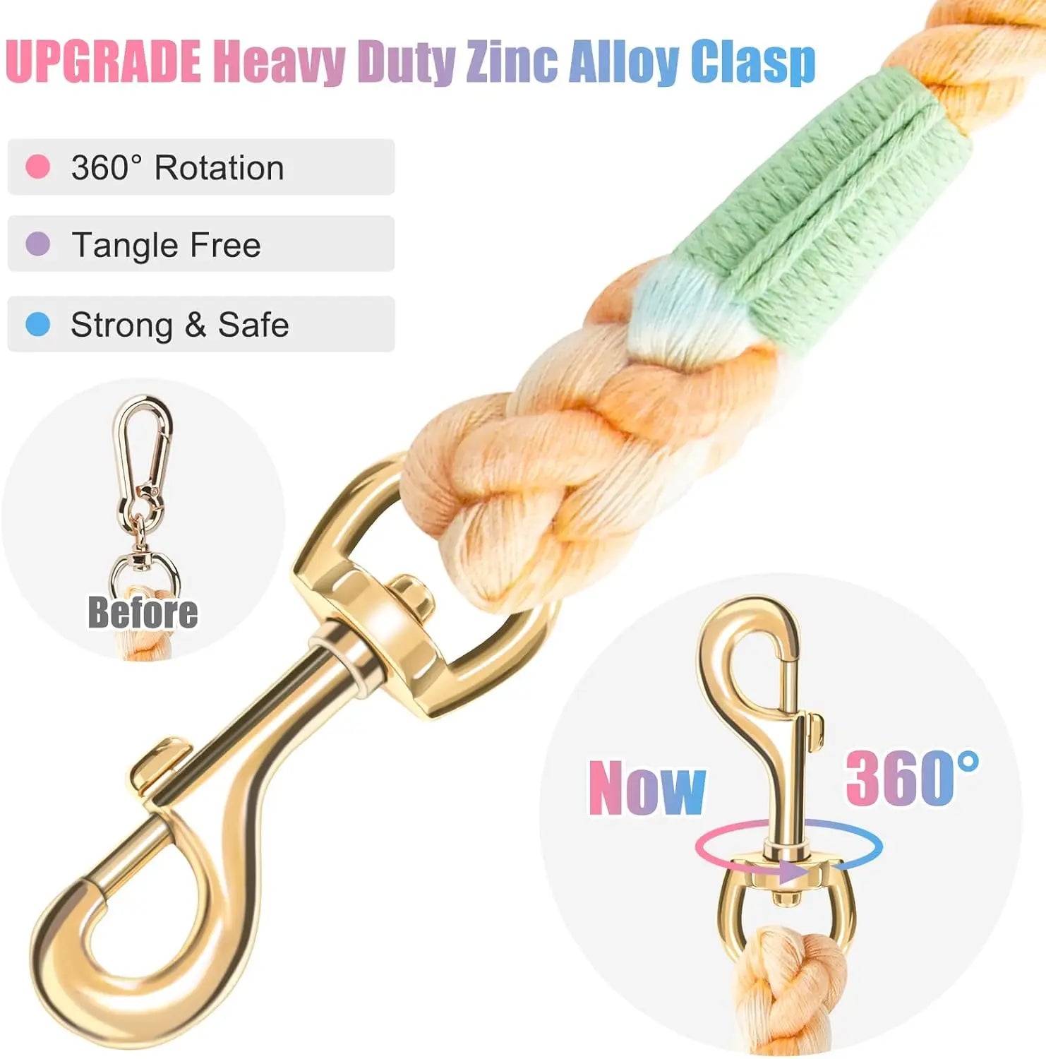 SIZE & COLORS: Available in 5, 6 feet lengths, 1/2" diameter rope, ideal for medium and large dogs. Recommended weight range: 20-100 lb. Choose from 5 beautiful colors and 4 classic shades: Macaron, Unicorn, Rainbow, Moss Green, Cherry Blossom Pink, Light Green, Dark Green, Grey, Black.