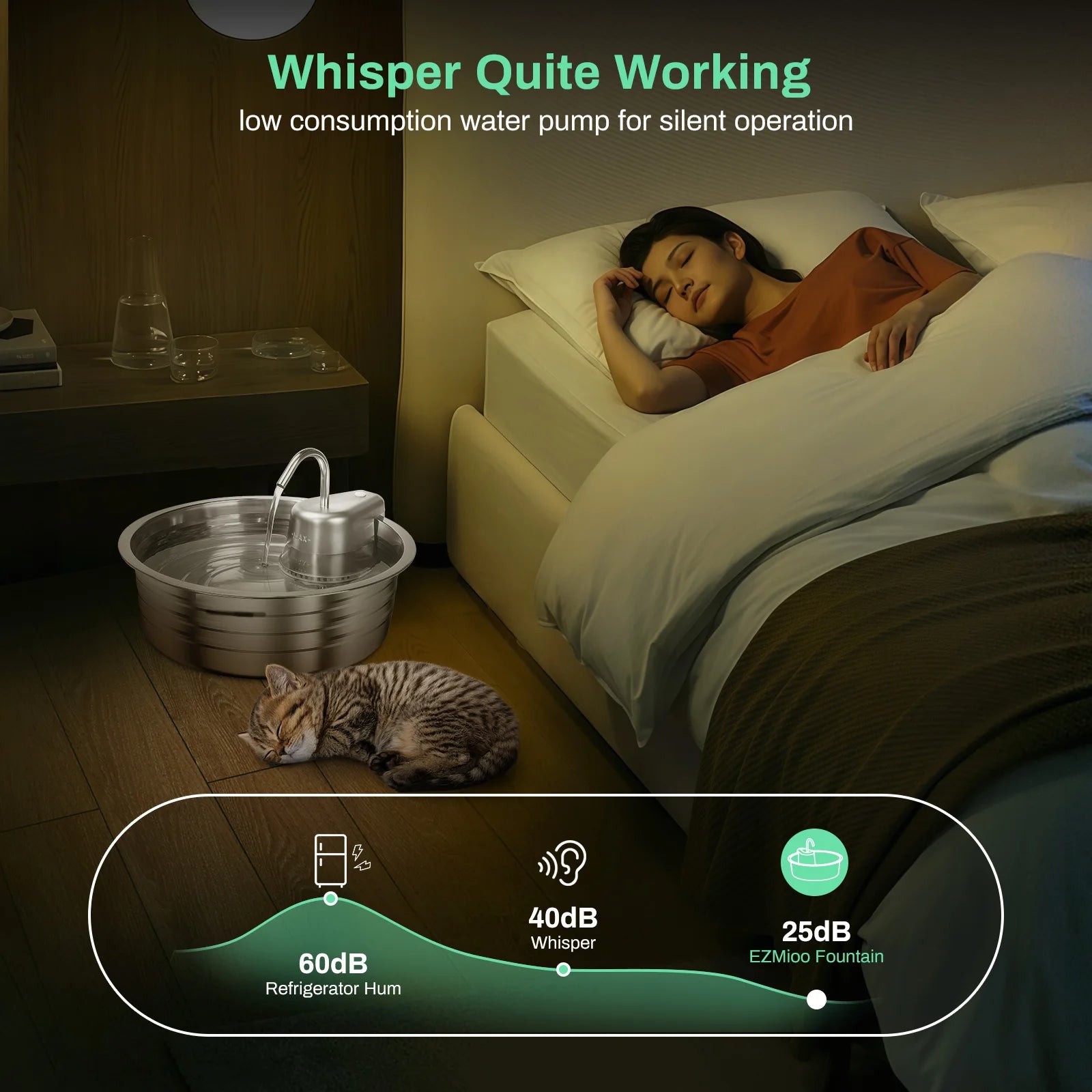 This pet fountain comes with a 1.5W low-power consumption pump that operates super silently, close to 20 dB. Even when it runs at night, it won't disturb your sleep.