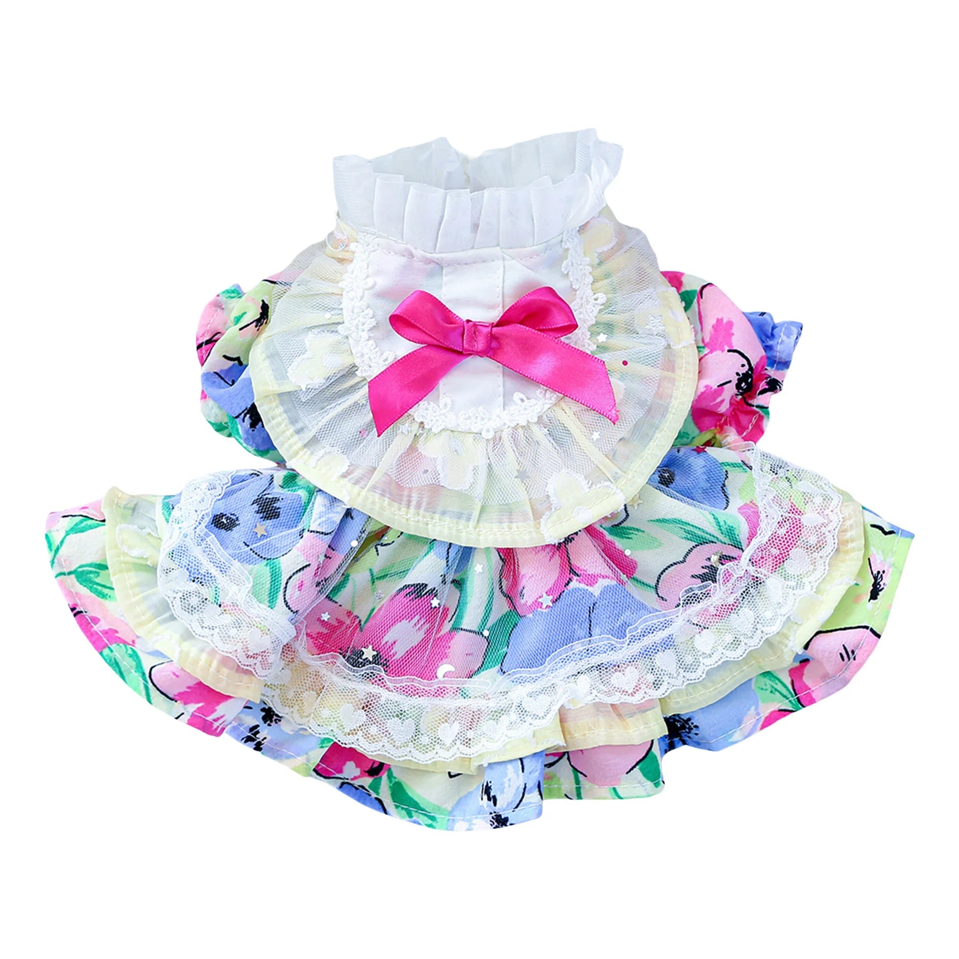 Dog Princess Dress Stylish Flower Print Mesh Lace Ruffled Trim Decorative Bow Bubble Sleeve Pet Dress
