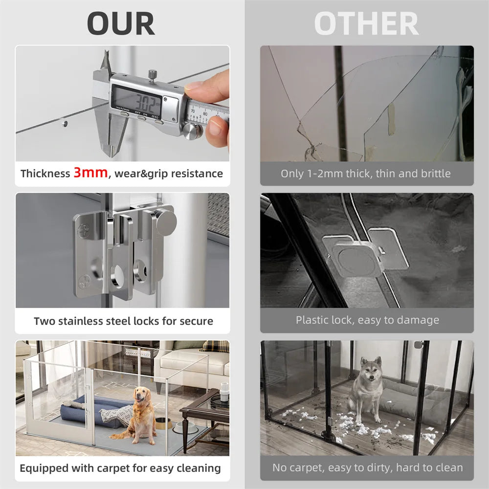 Transparent & Modern Aesthetic - The crystal-clear acrylic grants you intimate interaction with your pets, diminishing their unease with its open aspect, The 360-degree transparency offers pets an unobstructed panorama of their environment, reassuring them of your proximity, An exquisite addition to your abode, this fence is a splendid present for your cherished companion, instantly elevating your home’s aesthetic