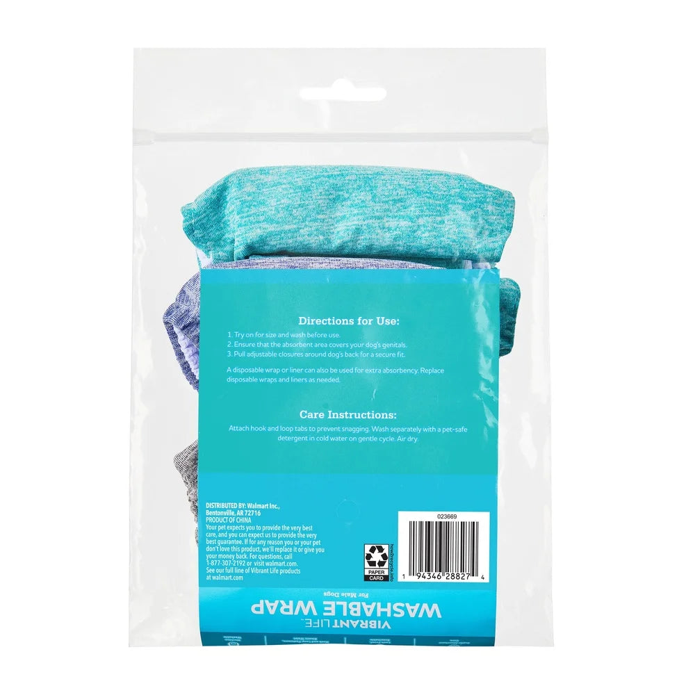 The inner core is super absorbent and the wrap has repositionable hook-and-loop fasteners. Try on for size and wash before use. To use, position the wrap so the absorbent area covers your dog's genitals. Pull adjustable closures around the dog's back for a secure fit. A disposable wrap or liner can also be used for extra absorbency. Replace disposable wraps and liners as needed. These dog wraps are size extra-small for dogs with a waist size between 9 inches and 11 inches. Attach hook-and-loop tabs to prevent snagging before washing. Wash separately with a pet-safe detergent in cold water on gentle cycle. Air dry.